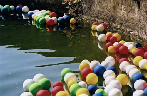 Bassin, boules en polystyrène (100 de ø 80 cm, 150 de ø 100 cm), cordelette (passage du fil d'Ariane)