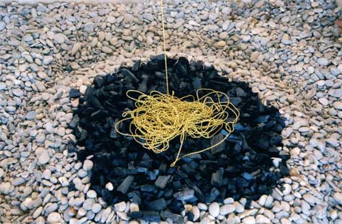 Charbon de bois, cordelette (départ du fil d'Ariane, bobine de 100 m), petits galets