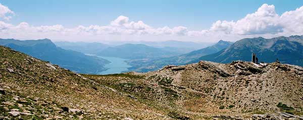 Une colonne miroir réfléchissant un point lumineux vers la vallée, du lever au coucher du soleil, variable suivant l'heure et les saisons est placée sur trois sommets de l'embrunais (le Morgon 2323 m, le Mont Guillaume 2542 m, l'Orel 2496 m (photo prise du sommet).