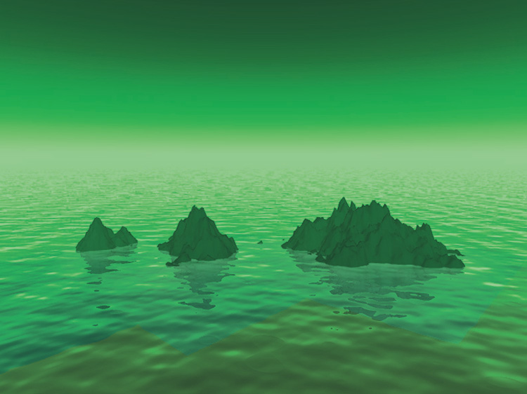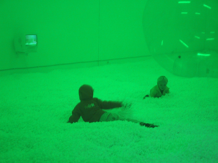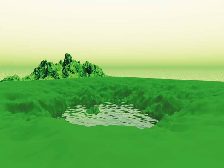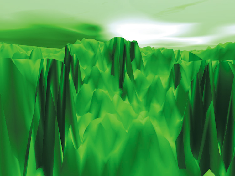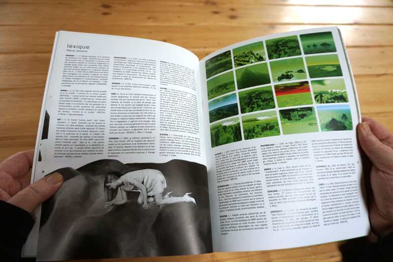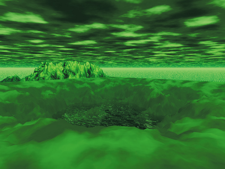 Au sol : chips de protection, machine à fumée, éclairage vert, vidéo (Paysage chimique), dimensions et matériaux variables.