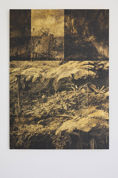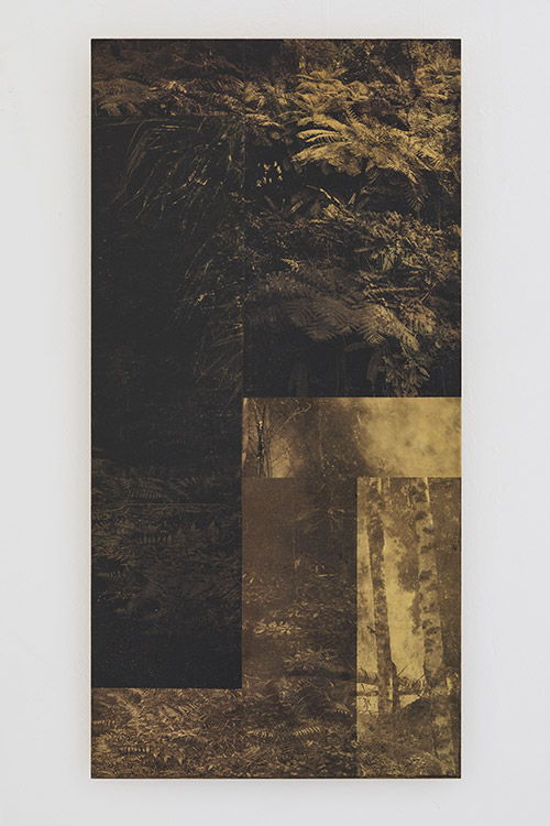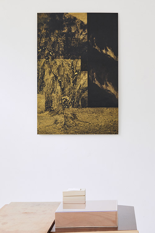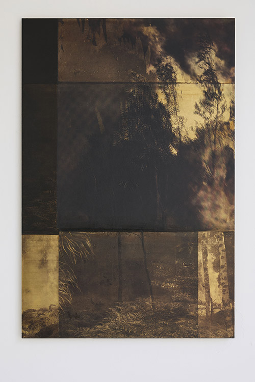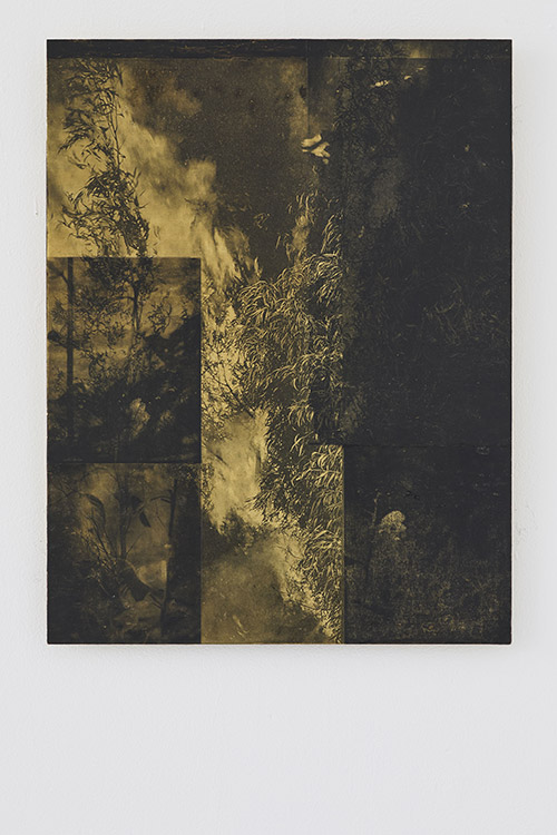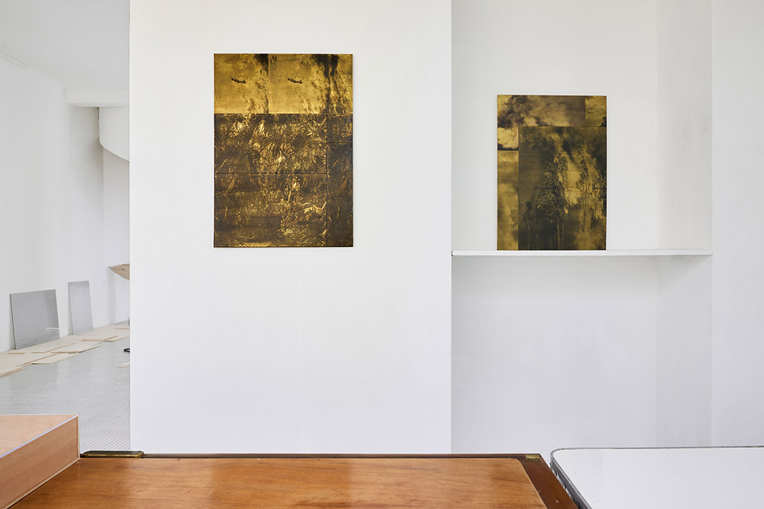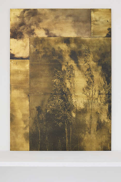 In the Solve-Coagula series - (2021-...) - landscape photographs are transferred in successive phases to brass plates, combining intervation with oil paint. While the images in the first series represent skies whose nature, between cloud and explosion, remains ambiguous, the Solve-Coagula (Solastalgia) series focuses more specifically on images of fires and forest conflagrations. The title, borrowed from environmental philosopher Glenn Albrecht, describes unease, the erosion of a sense of belonging, and a form of desynchronization in the face of a disappearing nature.