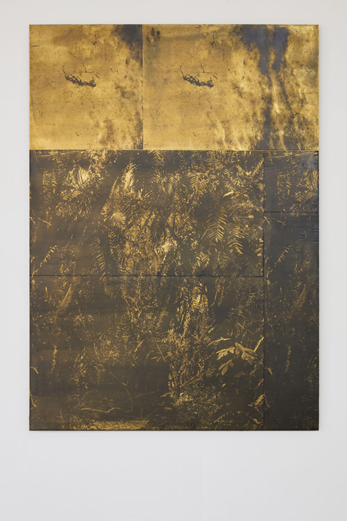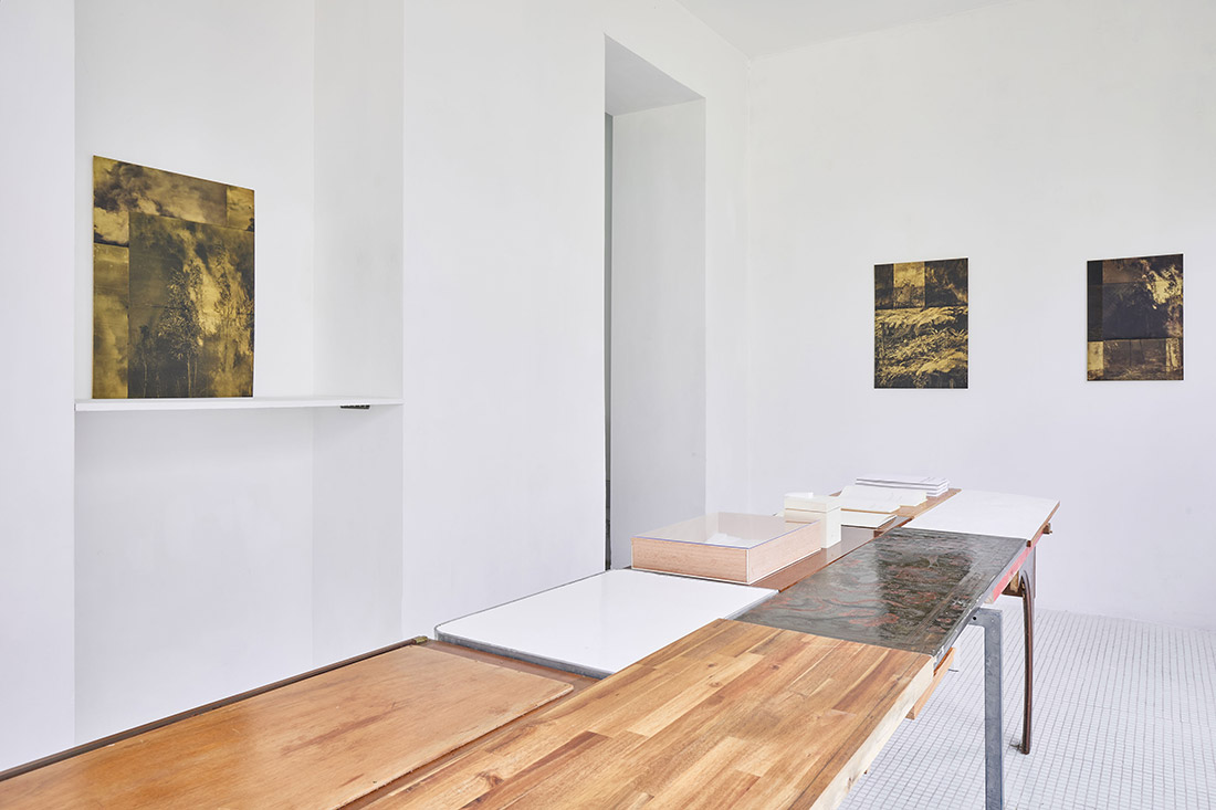 Dissoudre-Coaguler - (2021-...) - des photographies de paysages sont transférées par phases successives sur des plaques de laiton, puis retravaillées à la peinture à l'huile. Si dans la première série les images représentent des ciels dont la nature entre nuage et explosion demeure ambigüe, la série