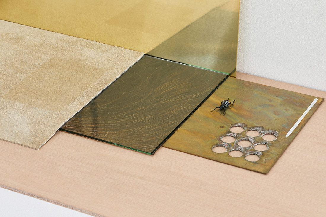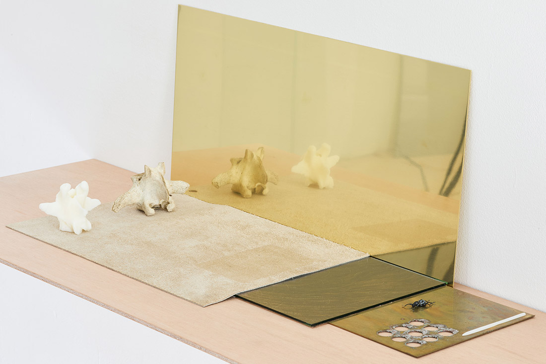 Bone vertebra, wax vertebra, leather skin, wax needle, scarab beetle, inkjet print, brass, wooden support