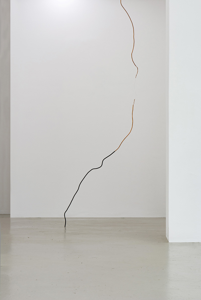 Crossing the exhibition space from one end to the other, an electric cable pierces the ceiling, growing longer and thinner. It mutates into a copper bar, into several copper wires, before becoming a single copper wire, then no more.