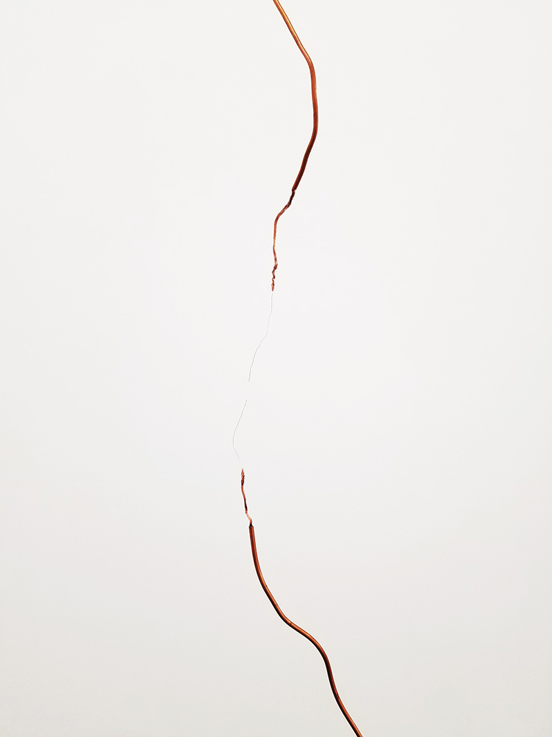 Traversant l’espace d’exposition de part en part, un câble électrique perçant du plafond, se prolonge, tout en s’amincissant. Il mute en barre de cuivre, en plusieurs fils de cuivre, avant de ne devenir plus qu’un seul fil de cuivre, puis n’est plus.