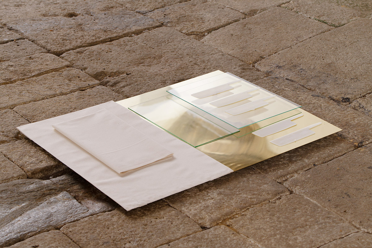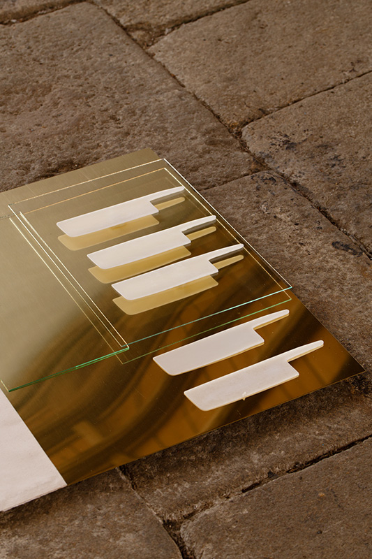 Laiton, toile à patron, lames en cire, verre