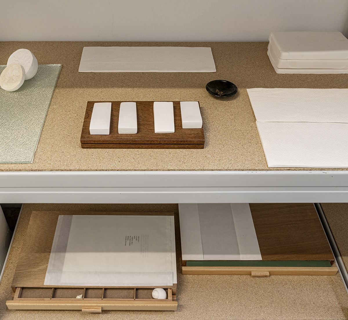 Textes, éditions, marges d'éditions, moulages en plâtre, impressions jet d'encre, boîtes, tiroirs, verre