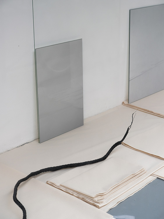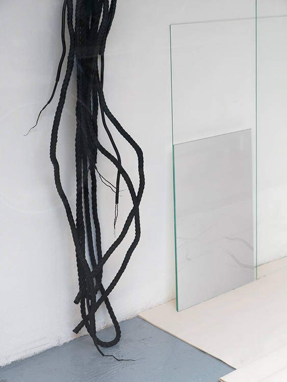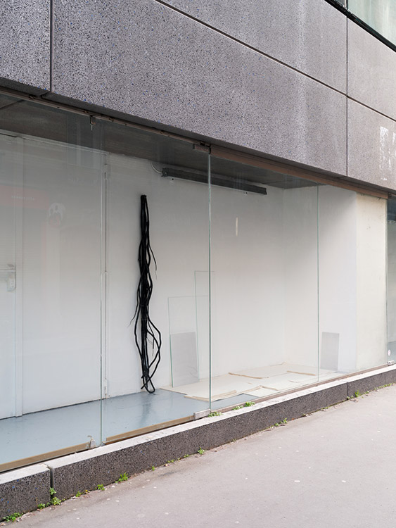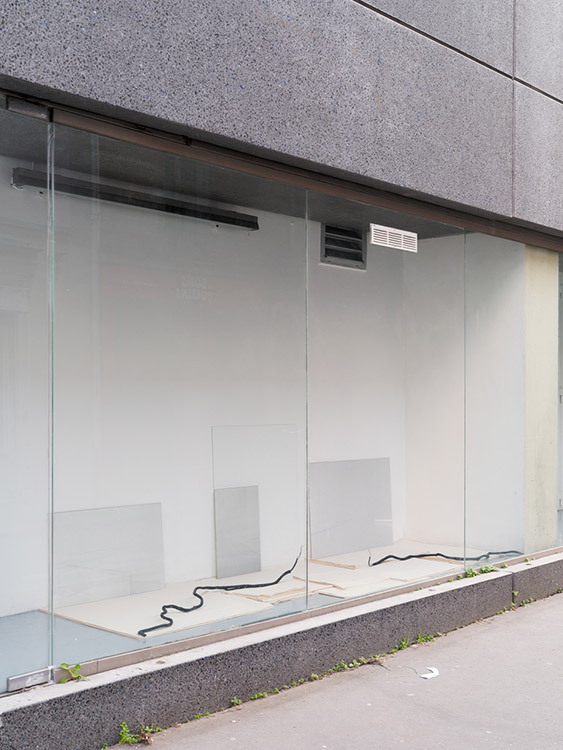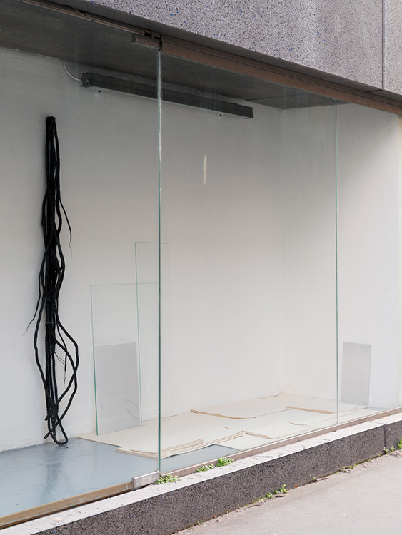 Faisant écho aux deux vitrines qu’elle investit ici, l’artiste y introduit un jeu de faux-reflets, brouillant ainsi nos repères spatiaux et temporels. Une impression de désorientation amplifiée par les signes d’une tension palpable entre forces vitales et destructrices, formes immuables et organiques, sensations du dedans et du dehors, souvenir et projection.