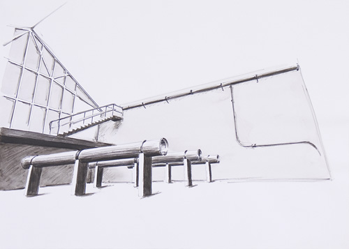 Croquis de recherche, encre de chine sur papier, 50 x 65 cm. Etude des tubes et des ressorts de résonance, 2006. |