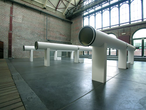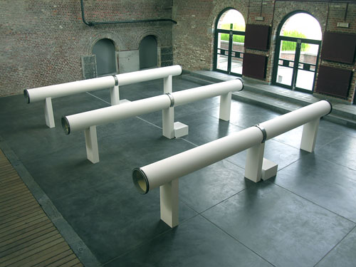 Conçu pour la Machine à Eau de Mons, le dispositif Sonotubes est équipé de trois évents cylindriques, chacun d’une longueur de six mètres. Placés horizontalement à un mètre au-dessus du sol, ces fûts sont traversés de longs ressorts en tension. Ils produisent par contact solidien avec des vibreurs très basses fréquences, des vagues de réverbérations sur les sons diffusés en continu. Par un principe de segmentation spatiale et temporelle, l’oeuvre divise la galerie en trois zones d’émission distinctes à l’intérieur desquelles le spectateur peut tracer son propre chemin d’écoute. L’architecture singulière du lieu quant à elle se charge de fixer les sons et d’amplifier l’effet directionnel que produit cette « machine de diffusion ». |