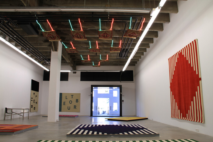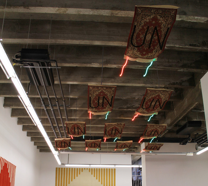 Vues de l'exposition MUN Multiples Uniques Noués, Daniel Buren, Patrice Carré, Philippe Cazal, Peter Halley, Lawrence Weiner, Galerie G. Verney-Carron, Lyon / Résonance Biennale de Lyon 2011 |