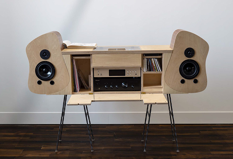 Contreplaqué de bouleau verni, placage en sapelli verni, piétements en métal torsadé, capot de la platine tourne disque en Altuglass transparent.