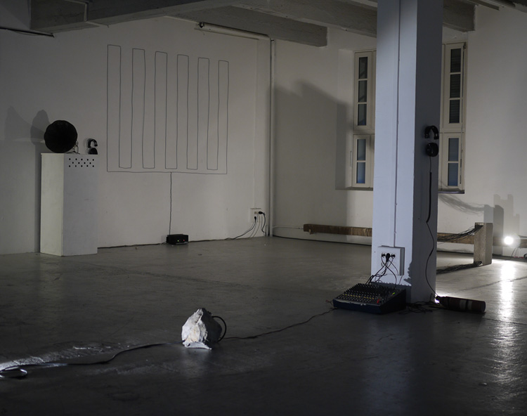 La pièce constitue un des 12 maillons de l’oeuvre Radio Fishli&Weiss du collectif π-Node. Chaque maillon reçoit le son de l'oeuvre précédente, la fait transiter dans un matière (lumière, radio, eau, solide…) avant de l'envoyer à l'oeuvre suivante.