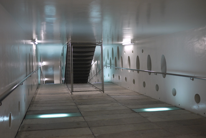 Hyal crée une présence sereine dans la passerelle. Une trame sonore anime l’espace d’une matérialité et de densité chaleureuse qui met le passant au contact d’une sensation de poids et d’opacité de l’air intérieur. La matière sonore révèle simultanément une transparence acoustique au sein de la passerelle et une perméabilité vers l’extérieur qui sensibilise aux bruits de l’espace environnant. Sur un second plan sonore, par intermittence, des textures curieuses circulent et traversent rapidement la passerelle de part en part. Les deux composantes créent deux temporalités et deux cadences spatiales qui accompagnent les passants dans leurs traversées. Formée de matières sonores électronique et abstraites, la composition sonore enrichie la teinte futuriste donnée par l’architecte au batiment. |