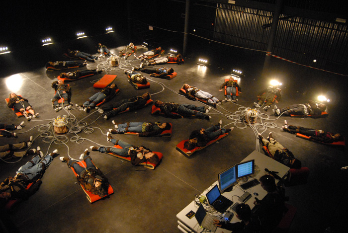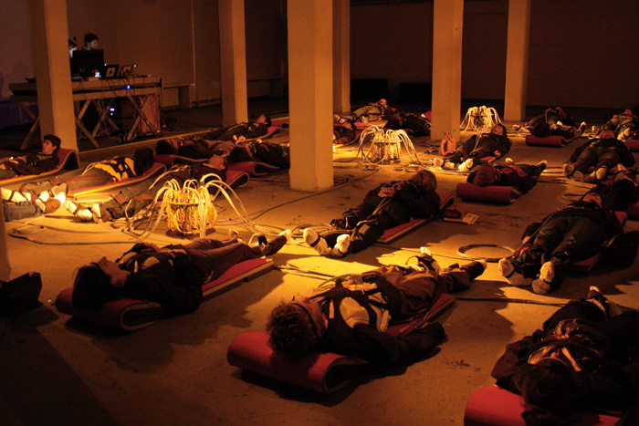 LP : Depuis la première installation en 2003, il est apparu que l'expérience audio-tactile commence dès l'accueil du public avec l'équipement individuel des auditeurs. Pour Stimuline, nous avons opté pour une interface corporelle qui laisse de la liberté de mouvement au public, et surtout la possibilité de varier la position d'écoute en cours de concerts. Debout, la surface de contact est réduite avec le sol et la perception du corps se fait en 3 dimensions, tandis que couché tout
