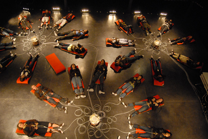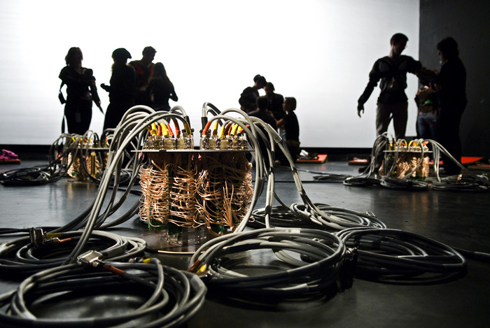 JC : Alors que nous étions encore dans la création de Pause, nous avons évoqué une version de concert qui nous permettrait de quitter les formats courts des installations audio-tactiles et d'explorer plus en longueur les particularités surprenantes de ce mode de diffusion. La matérialisation du lien entre le musicien et le public nous intriguait aussi. Dans un concert, c'est l'air qui conduit la vibration des haut-parleurs à chacun des auditeurs. Dans Stimuline, l'air est remplacé par des câbles, connectés à l'auditeur via une interface corporelle équipée de transducteurs. Le lien est visible et la structure du réseau apparaît clairement. (...) Dans Stimuline, les spectateurs équipés et connectés participent à la scénographie... L'idée est de réaliser des propositions in situ qui explorent et confrontent par le son l'architecture du lieu et l'espace du corps. (...)