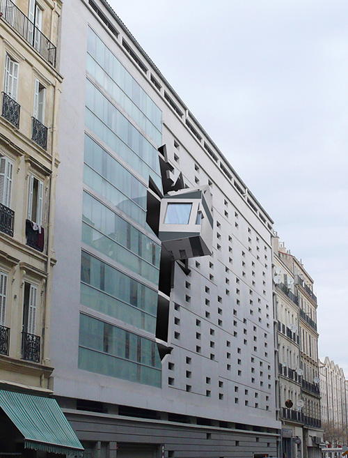 De l’art du papier à l’ère du béton ou comment retourner la peau d’un bâtiment comme une pelure d’orange pour construire une maison accrochée à la façade qui l’a générée.