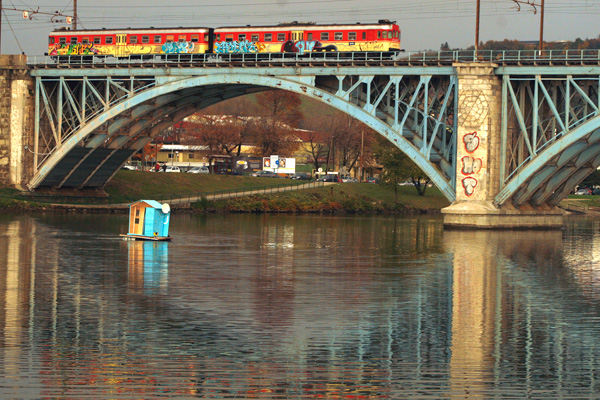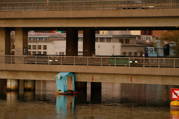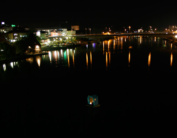 La Drava est fermée de part et d’autre de la ville de Maribor par deux barrages hydroélectriques qui empêchent toute navigation fluviale. Un double pont a même été construit au niveau de l’eau. Le projet Overflow tentait de créer un climat de tension artificiel: dans un même temps, une destruction massive de la ville (194db d’Anne Valérie Gasc) et une fuite possible par la voie maritime au moyen d’une embarcation de fortune aux couleurs des nations unis (UN Rescue).
