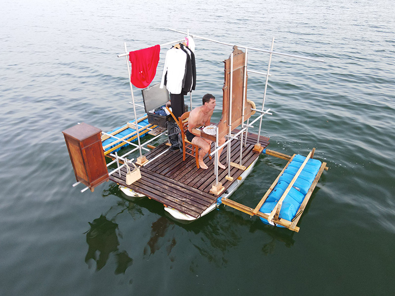 J’ai donc pensé mon radeau comme une forme hybride, sculpturale ou plutôt comme une sorte de décor flottant, un décor pour un personnage en prise avec sa propre quête intérieure. En plus des nombreux éléments récupérés sur la base nautique, j’ai emporté des éléments de mobilier traditionnel chinés autour de l’étang (coiffeuse, table de chevet, chaises et penderie) pour les suspendre en quelque sorte au-dessus de l’eau, accrochés à des tubes de métal comme des extensions, des prothèses.