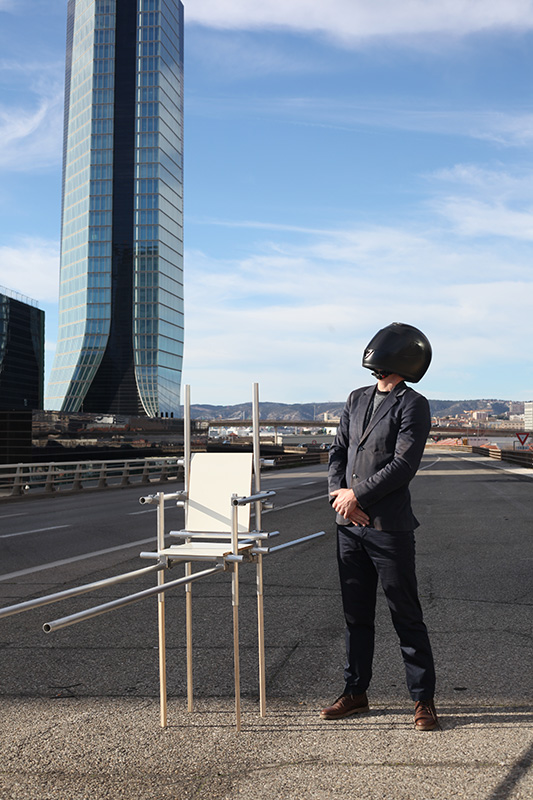 Qu’il est beau ! Quelle allure ! Casque intégral. Smoking. Shooting de rêve sous la tour CMA. Perspective magnifique sur le futur quartier d’affaires.