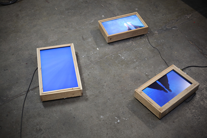 Sur certains écrans, des corps oscillent en apesanteur dans la mer.
