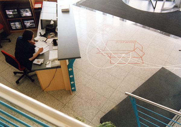 For my intervention Moving (En déplacement) I chose the lobby of the Poseidonhaus in Hamburg. It’s a large building in the growing financial district called City Süd.