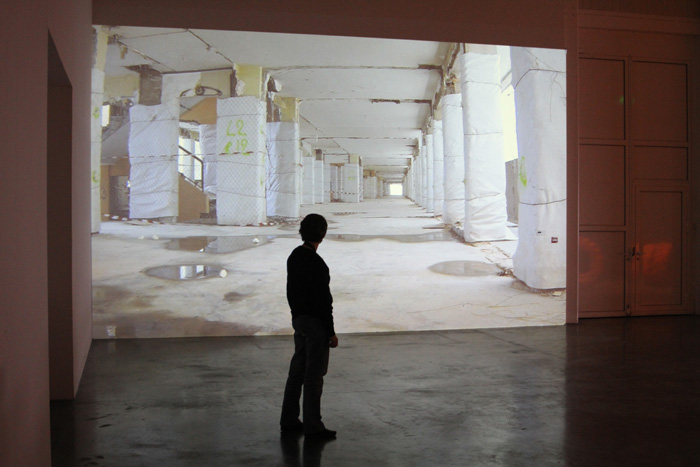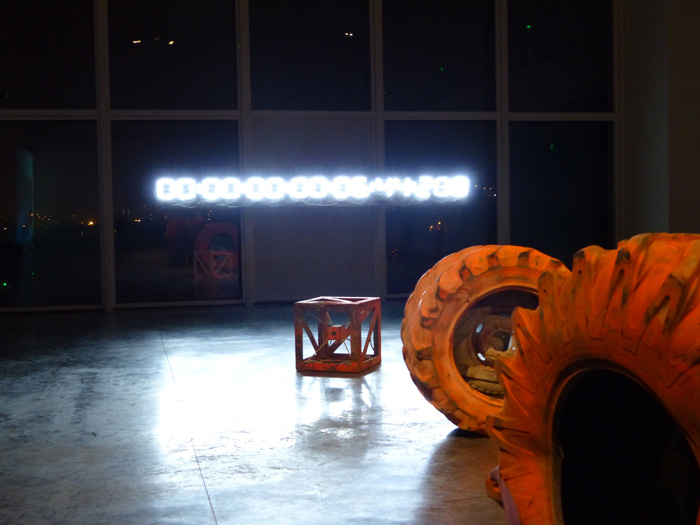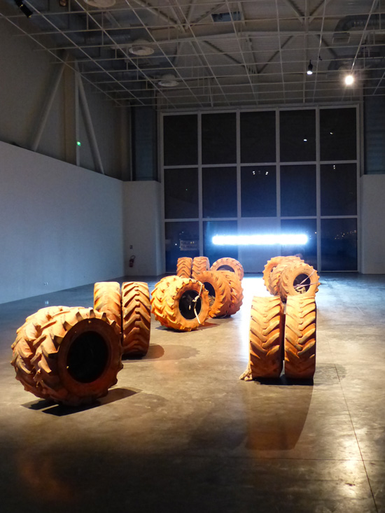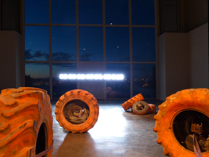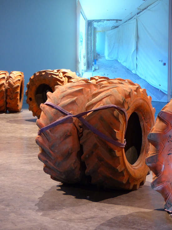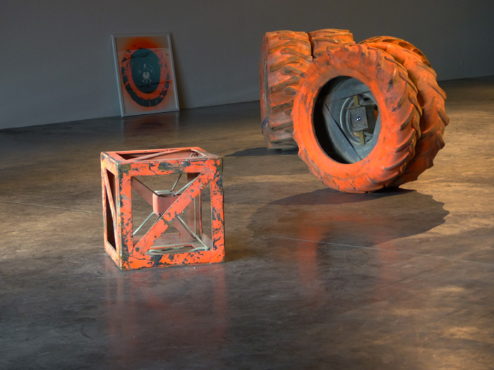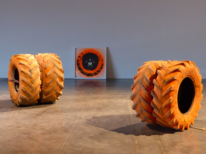 La sérigraphie ici présentée fait le portrait de cet oeil photographique : l'opercule central de l'image désigne le lieu de l'objectif de la caméra. L'auréole irradiante marquée manuellement à la bombe de chantier orange, occupe l'espace de la feuille là où, en volume, le pneu de grande dimension vient contenir le cœur du dispositif.