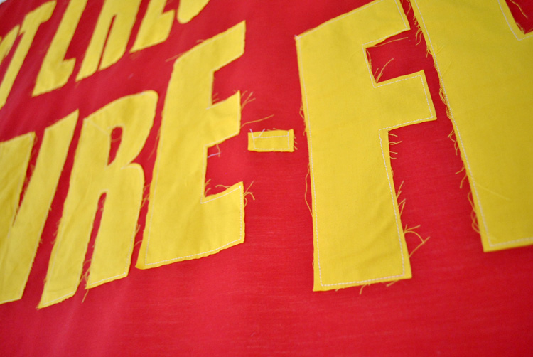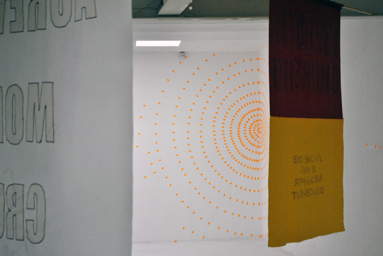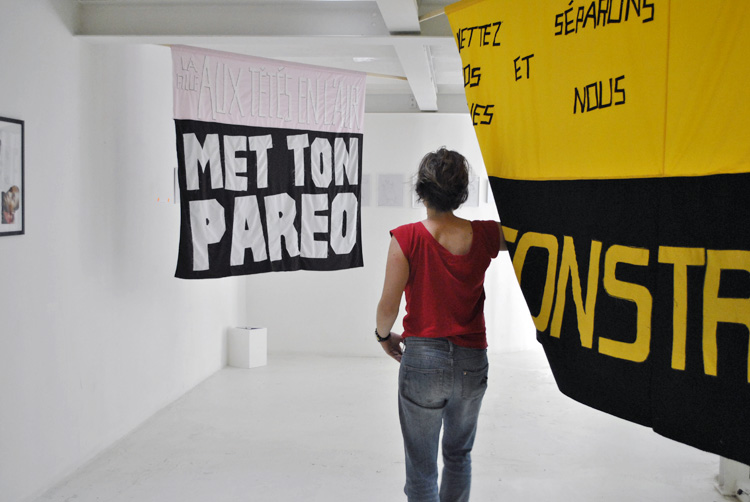 Art-cade est en centre ville. Y venir des quartiers Nord est synonyme d'expédition. Je voulais une conquête. C'est ainsi qu'ont pris forme les bannières. Elles représentent le groupe rallié derrière elles. Sont exposés les planches originales d'où sont tirés les slogans, comme un récit de l'expérience. |