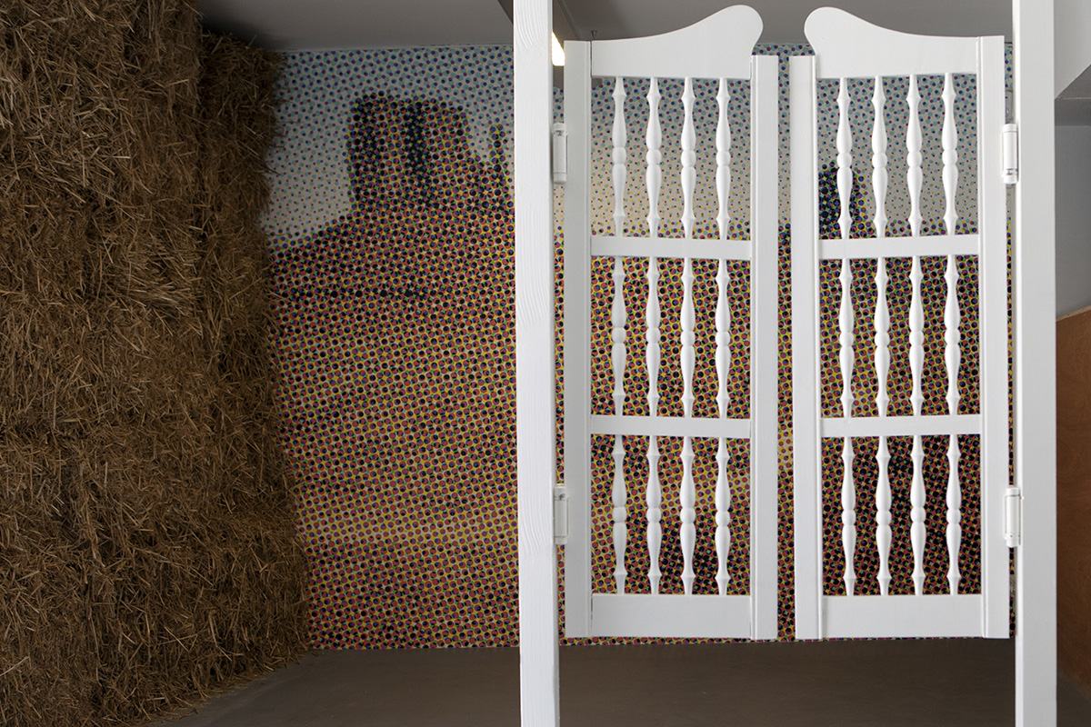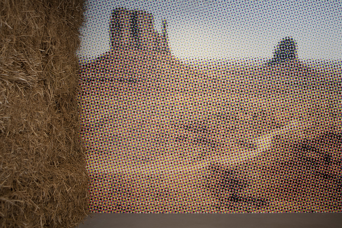 Comme dans la tradition du cinéma sans image des Lettristes (internationaux ou pas), le spectateur est invité à combler les vides. Ici ce n'est pas un débat qui est attendu, mais plutôt un raccommodage. On nous sollicite pour rapiécer une histoire selon notre bon vouloir, notre bon pouvoir – celui de l'imagination. Pas chiche, l'artiste a savamment orchestré dans l'espace de projection une suite d'objets comme autant d'indices potentiels. D'aucun parlerait du syndrome du chandelier dans la bibliothèque, mais présentement, le décor est bien plus trivial. Le lieu esquissé semblerait plus indiqué pour s 'adonner à la boisson qu'à la culture livresque. On s'y ferait dézinguer plus vite que son ombre avant d'avoir pu évoquer la potentialité d'un débat d'idées. Les portes de saloon, battantes sur leur châssis, esseulées au milieu de l'espace pourraient avoir été oubliées là par un bruiteur parti chercher pitance ailleurs quand il sût qu'il s'agissait d'un film muet. L'architecture sommaire de bottes de pailles obstrue la lumière naturelle et, par là-même, fait de cette pièce une salle obscure. Quelques autres bottes flanquent le sol comme attendant qu'un quidam fasse l'expérience de cette durée avec en plus, des brins qui pénètrent superficiellement les chairs de son postérieur. Enfin, marouflé sur un mur comme le poster d'un sous-bois au petit matin dans la salle d'attente d'un ostéopathe, un paysage fait un pas de côté dans l'espace et le temps de la monstration. Par le truchement mécanique d'un logiciel de calibrage de trame, Aïcha Hamu a opéré sur cette figure typique une exagération de l'échelle qui nous oblige aux cent pas pour tenter d'en cerner le propos.