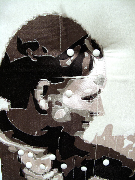 Broderie sur nubuck, capitons, mousse, bois, dimension totale du polyptyque : 90 x 90 cm