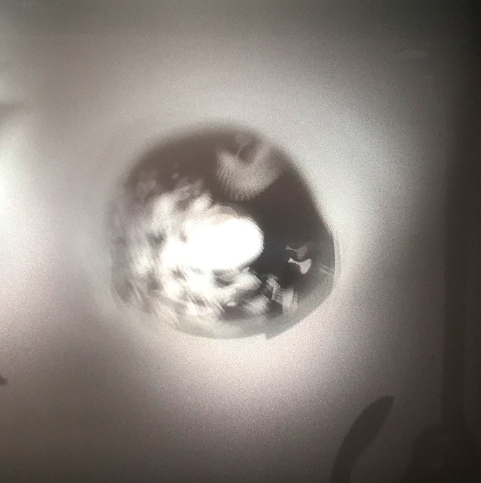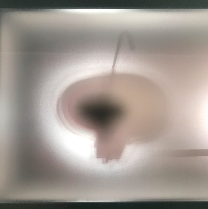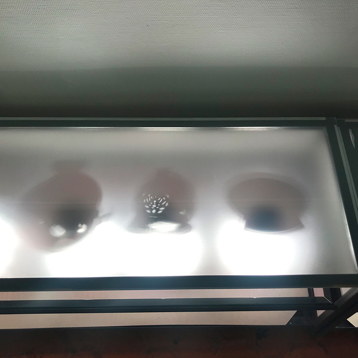 Six vitrines lumineuses contiennent lampes, lanternes et accessoires qui témoignent par leurs formes et leurs fonctionnalités de notre histoire de l’éclairage. Plutôt qu’associer à ces objets leur capacité d’éclairage, j’ai choisi de mettre en avant leur puissance à générer des ombres. Je vois en ces formes projetées – loin des contours de l’objet – une affirmation de la dimension poétique de nos objets d’éclairage.