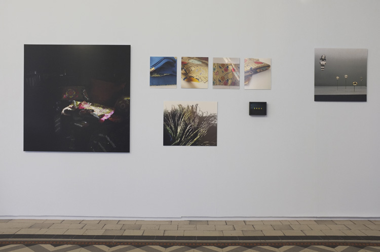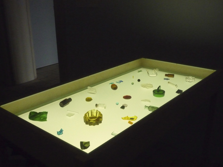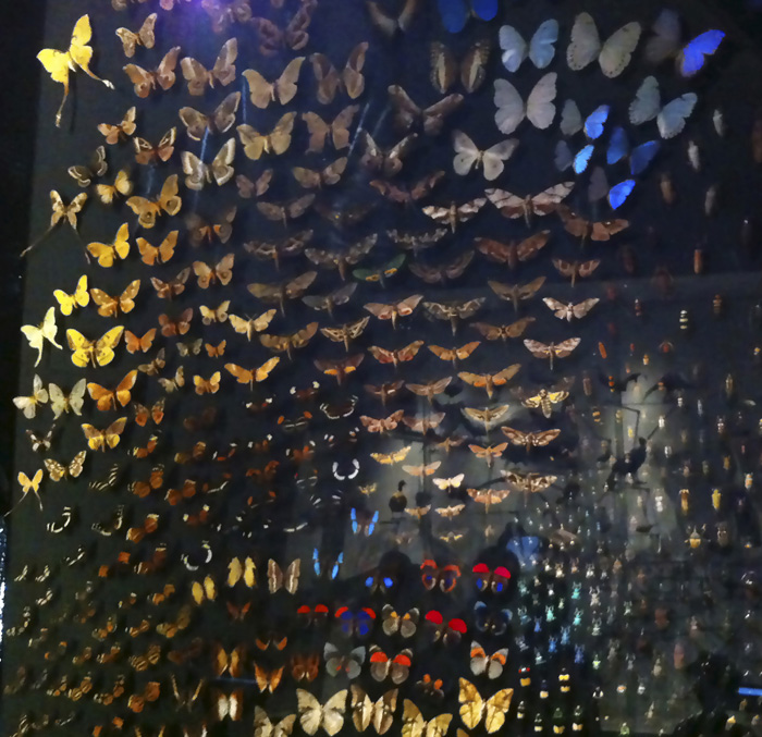 Installation : costume du Matador Juan Bautista ; boîte de 4 scarabées (plusotis resplendens), Costa-Rica ; ceinture de kimono brodée en fil d’or, Japon ; bijoux romains issus des fouilles du Rhône, Arles.
