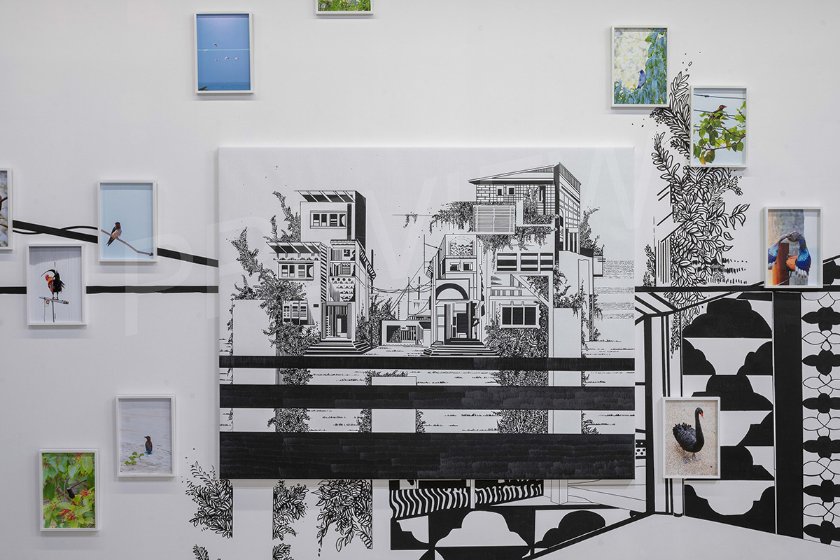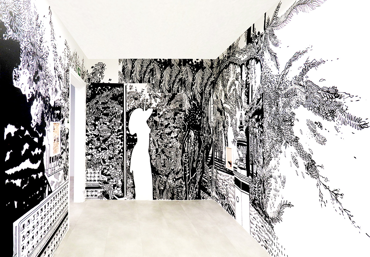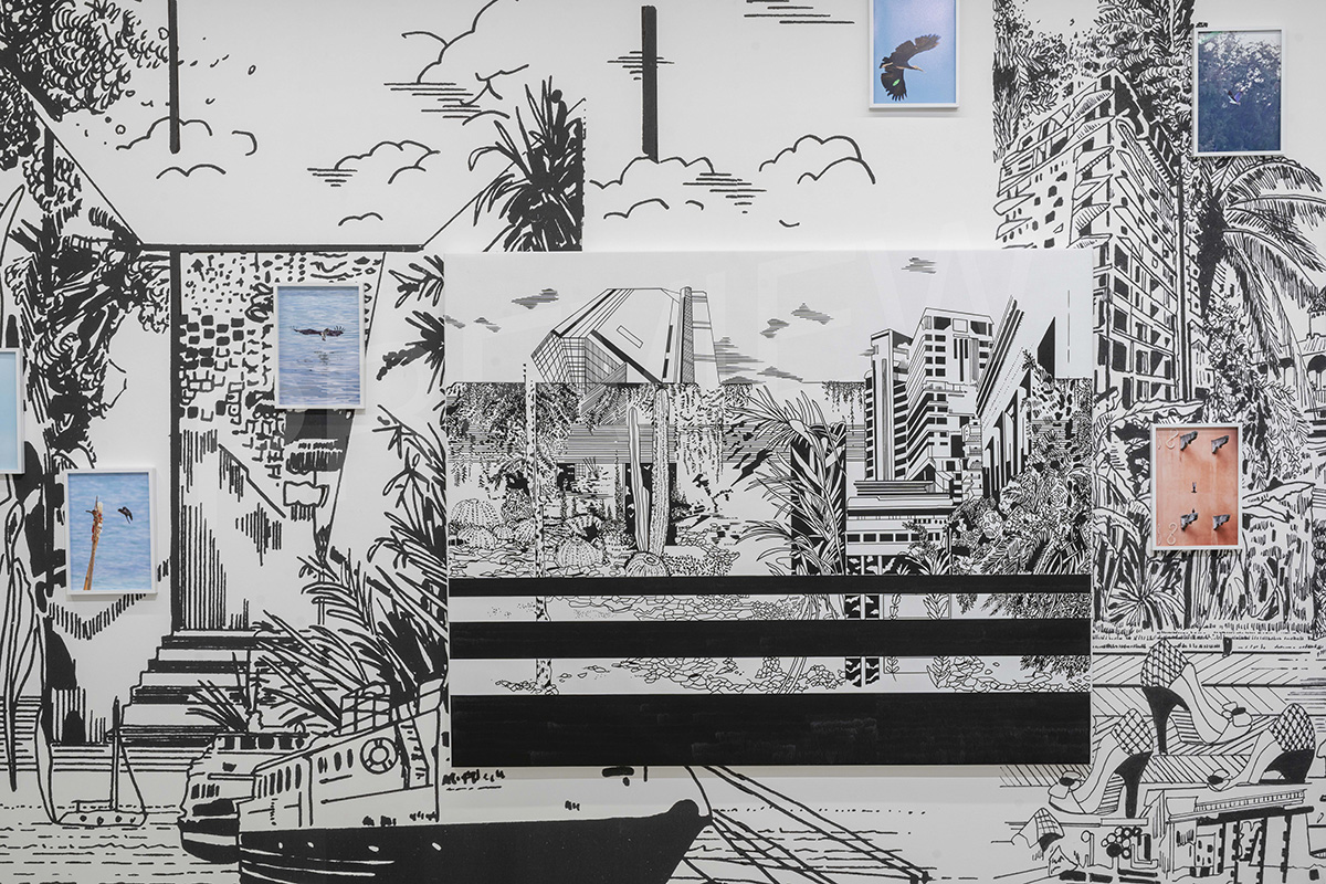 Pour le Drawing Lab, Chourouk Hriech déploie une géographie métaphorique reliant Bangkok à Casablanca, Tokyo à Marseille, une ville-monde dont les oiseaux seraient les premiers habitants. Ses visions kaléidoscopiques se télescopent dans l’espace entièrement investi par le dessin en noir et blanc, qui s’étend de l’échelle de la feuille à celle du mur ; ainsi que dans des installations immersives et des vidéos. Un cheminement foisonnant qui incite à la rêverie et à la déambulation, ainsi qu’à une expérience corporelle et mentale de l’espace, métamorphosé en un « nouveau milieu » : ici les règnes animal, humain et végétal se confondent à des stratifications de villes et de paysages.
