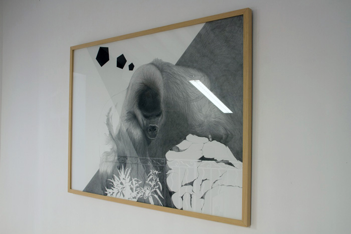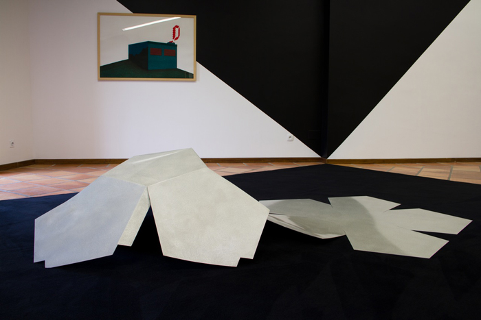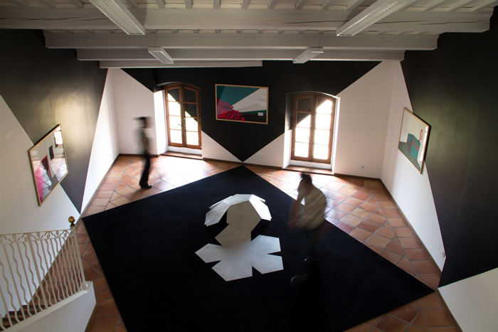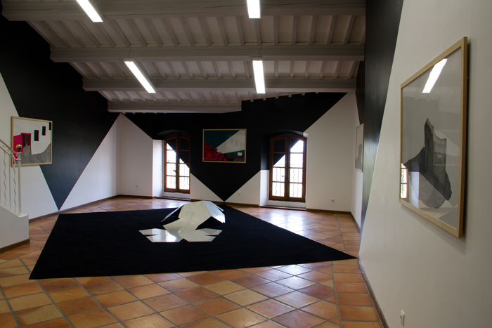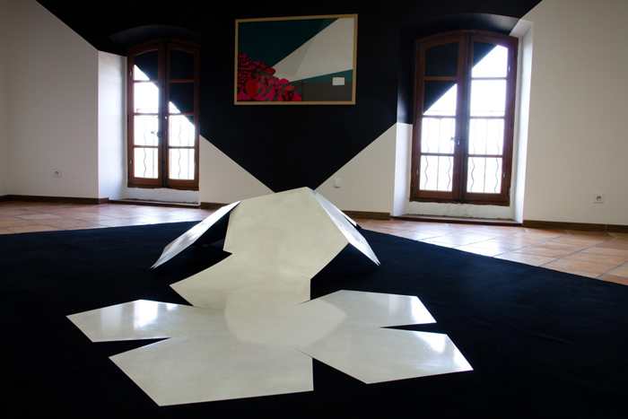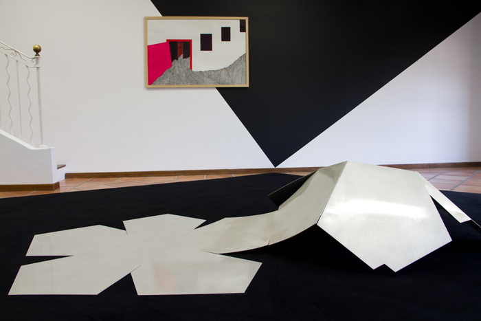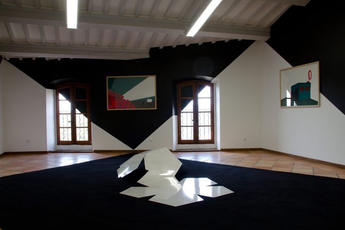 Au centre de la Chapelle, un étrange élément, à la fois architecture inachevée et figure géométrique tient le rôle central de l’exposition, tandis que la peinture murale engendre de nouveaux volumes qui modifient les perspectives du lieu, perturbent les sens et produisent des effets d’optique. Les dessins jettent les bases de ces contrastes, ils troublent l’ordre des choses créant des ouvertures fictives et poétiques vers des univers oniriques. L’espace devient instable, il est sans cesse transformé par les éléments qui entrent dans le cadre au fil des déambulations.