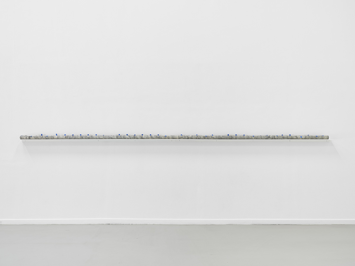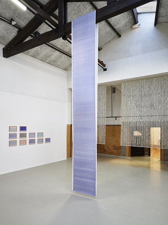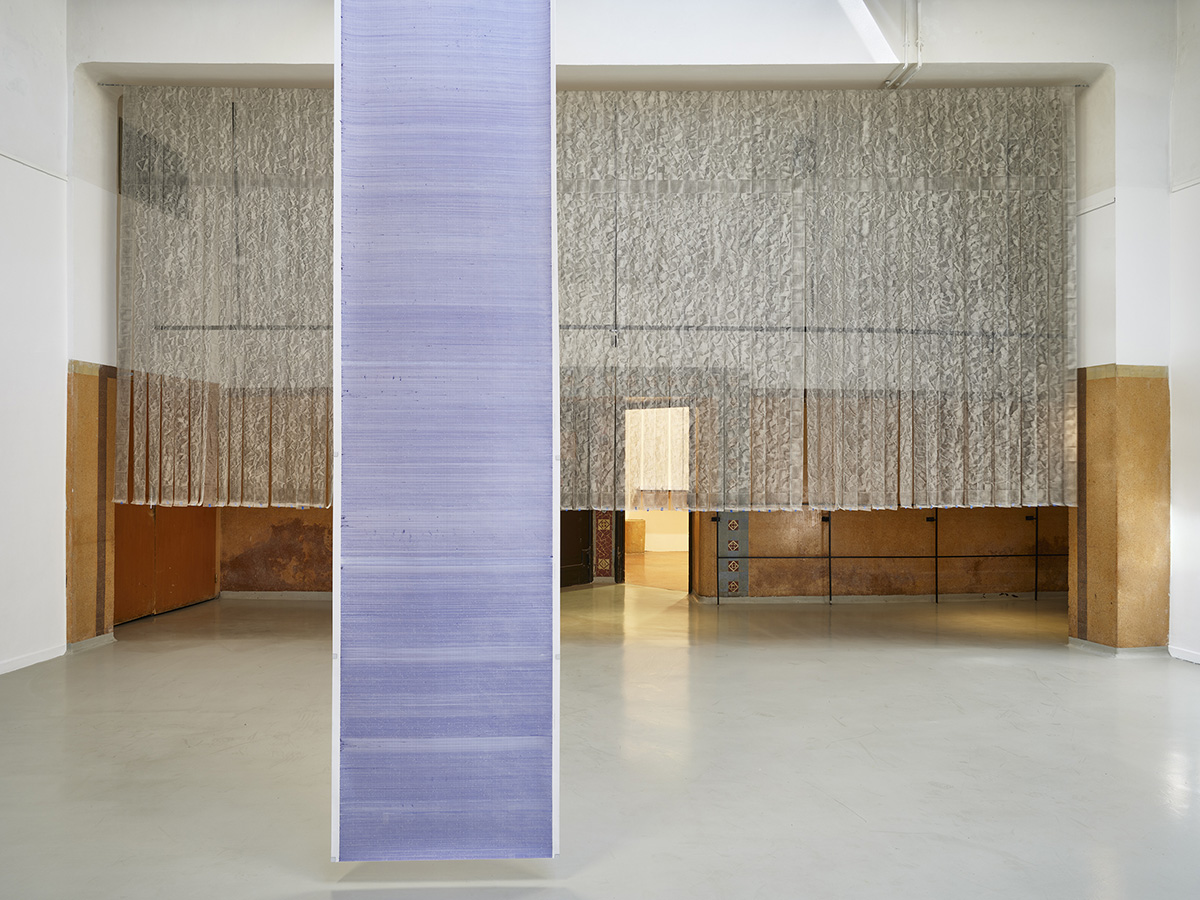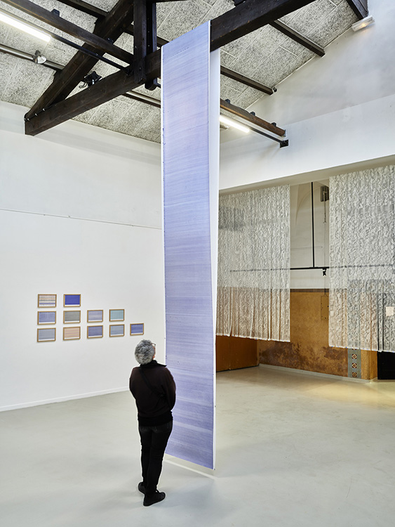 Suspendues en 73 bandes à l’entrée de l’espace, numérotées selon la classification d’un répertoire inhérent aux opus, l’empreinte du sol est hissée à la verticale, le sol diésé par cette bascule de 90 degrés devient une peau spectrale, telle une mue, dont l’exuvie fait apparaître son double incertain.