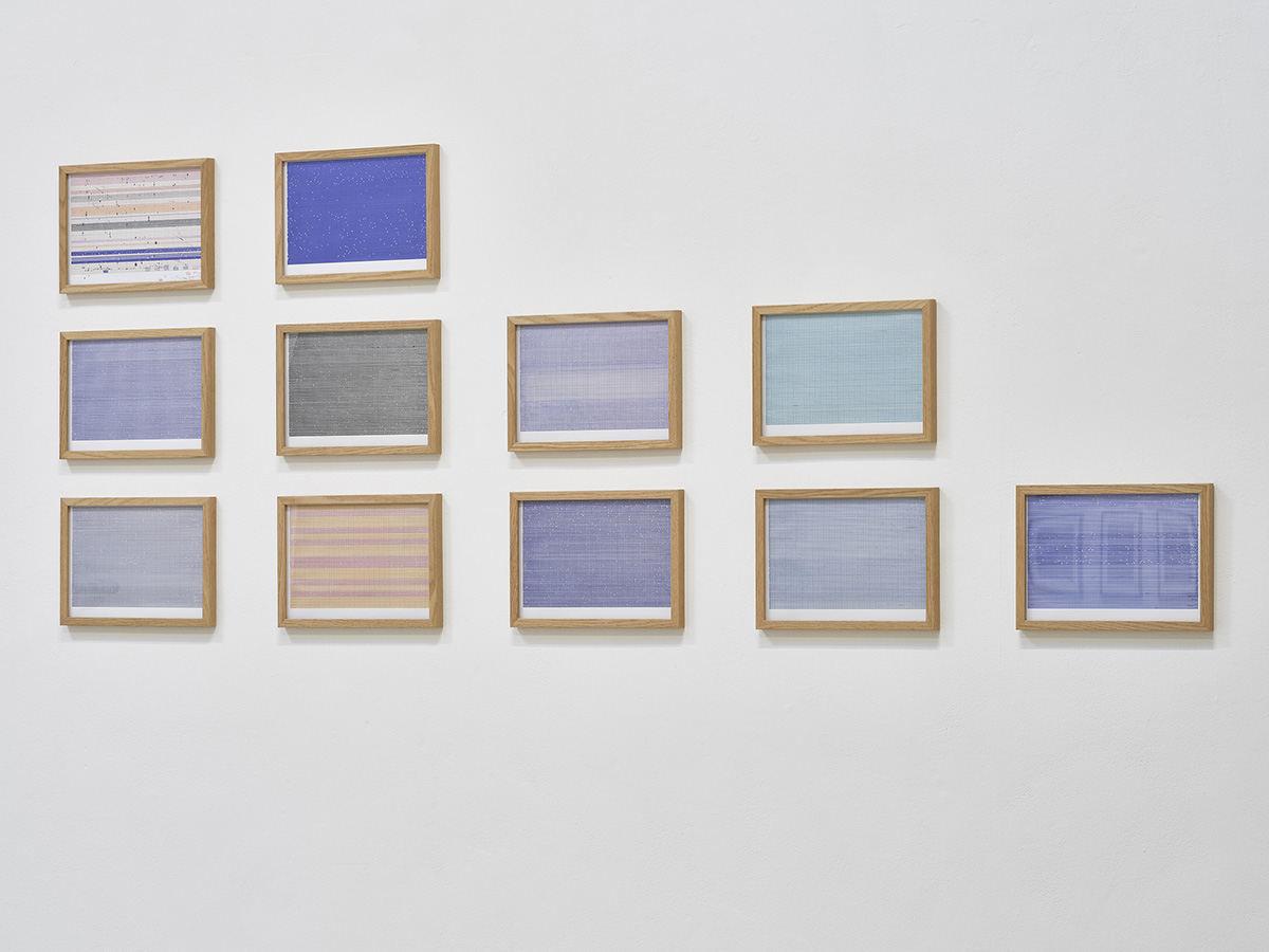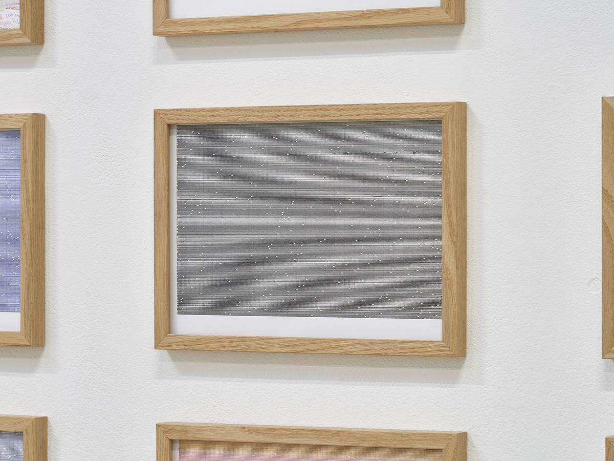 La série des onze : Dessins tests réalisés in situ à la blanchisserie, est un travail préparatoire au dessin suspendu : Sismographie cosmique. Leurs variations chromatiques sur papier millimétré, les différents essais de tracés et pointillés, ainsi que les mines de stylos employées, rend compte des hésitations et recherches entamées par Lina Jabbour pour tenter d’encoder les vibrations de la calandre avant de trouver sa méthode. L’entrée en matière dévoile un dénominateur commun : la présence d’espacements et zones de réserves dans chaque dessin. La série ainsi rassemblée suggère l’idée de gammes dont les écarts, formés par les minuscules zones de blanc, produiraient un son à la façon des cartons perforés des limonaires.