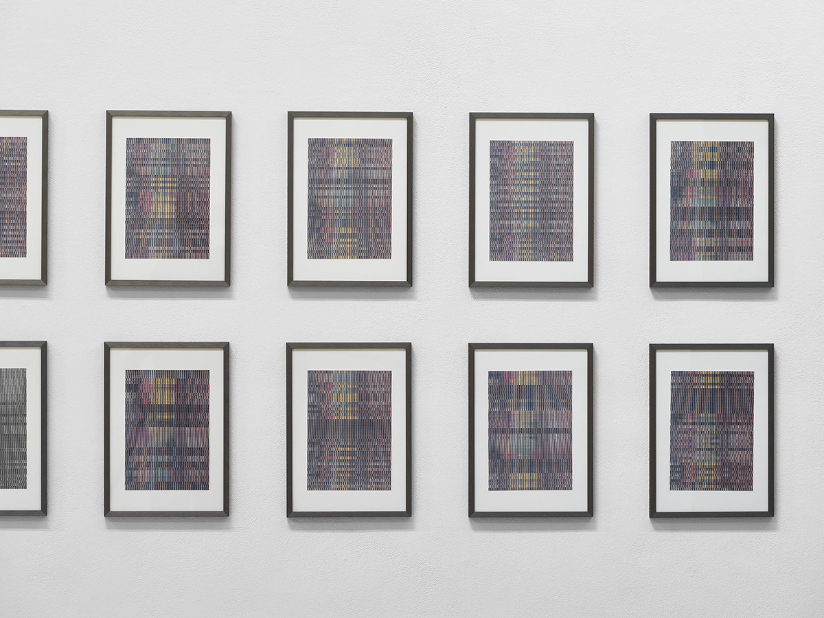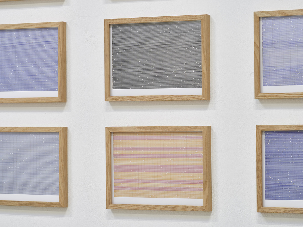 La pratique du réemploi et des variations issues des différenciations du même, rythme le travail de l’artiste comme en attestent la série Partitions et Percée en sud, coulez. À partir d’un reste des cartons d’invitation de son exposition Légers flous présentée à Mougins en 2019, Partitions est un travail de découpe de chacun des 36 cartons en 42 bandes de 5 mm réagencées, de sorte que le carton se transforme en pixels artisanaux et imparfaits renvoyant à une imagerie vibratoire,