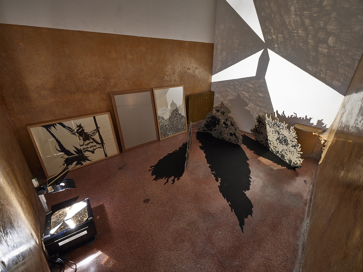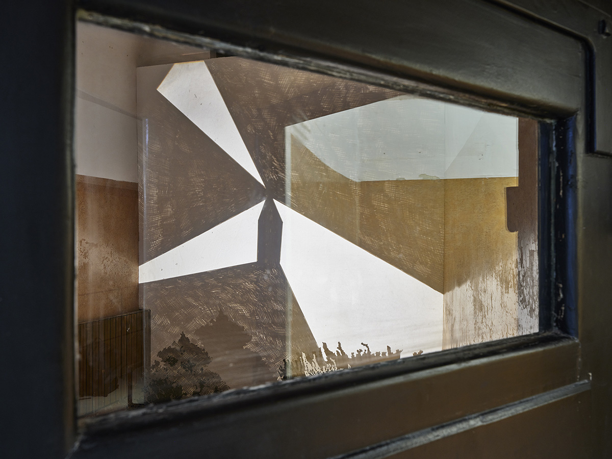 Le dispositif imaginé pour Percée en sud, coulez, nous révèle - depuis la lucarne d’une des cellules d’isolement obligeant à la posture d’un surveillant - une scène de mise à l’écart de dessins, d’objets, sculptures à la fois stockées et montrées aux présences redoublées par leurs ombres portées. Comme un bégaiement spatio-temporel, l’anagramme Percée en sud, coulez pour : Zone de crépuscule, reprend par cette interversion de lettres le titre donné par Lina Jabbour à son exposition au 3 bis f en 2009. L’anagramme visuel de ce titre revient sous la forme d’une déformation mnésique texturée de pertes et de gains. Les strates, couches, doublons, ressurgissent en archive combinatoire d’écarts et de zones de troubles.