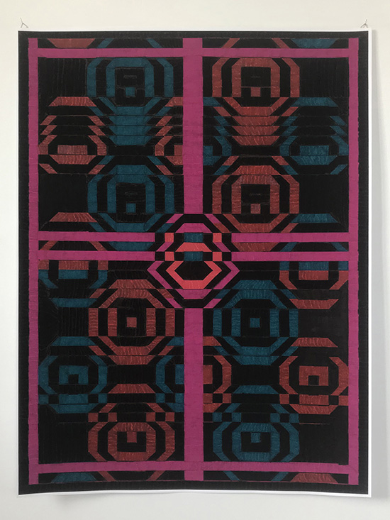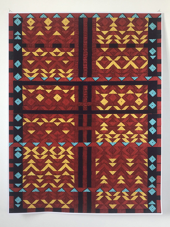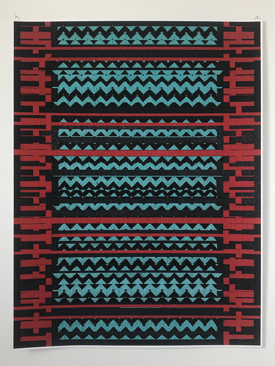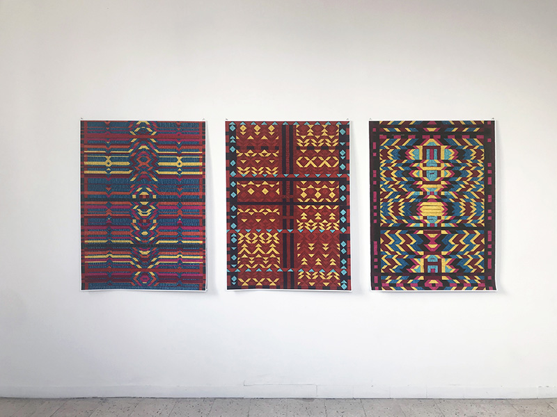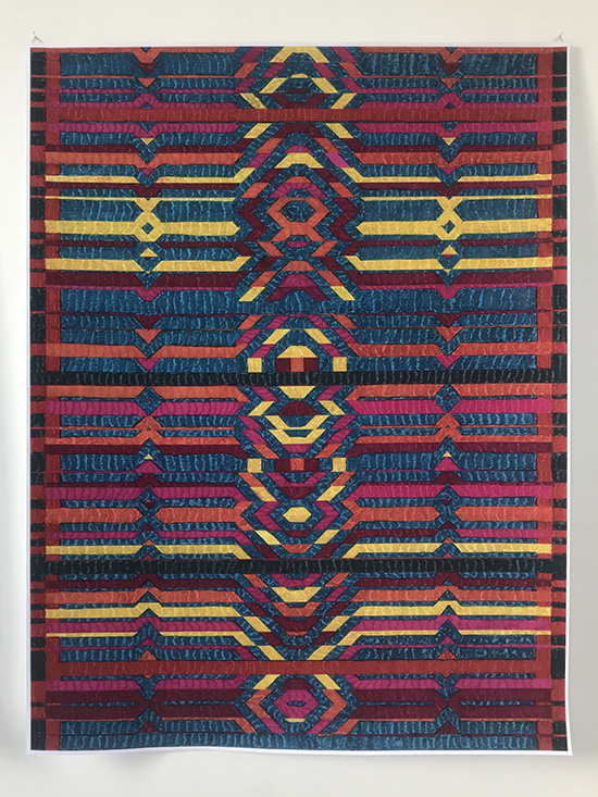 Première étape de travail : des études préparatoires sur format A4 librement inspirées de tapis orientaux. Ces esquisses sont dans un second temps scannées, agrandies puis découpées numériquement par bandes de 0,5 cm dans l’idée de déstructurer le motif initial, brouiller l’image telle une défaillance d’un système électronique. Un glitch. Un bug.