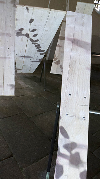S’il y a une parenté avec les « aires de jeux » qui ont fait l’objet des recherches antérieures, ici le rapport à « l’usage » est déjoué par les détails de coupe des planches, l’inversion des fixations les rendant impropres à supporter du poids, et la fine couche de craie frottée sur le bois. Leviers, balanciers, tremplins formés par les différentes longueurs et inclinaisons tournent le dos à la verticalité attendue d’un écran, lui préfèrent l’instabilité du discontinu, l’incertitude de trajectoires obliques.