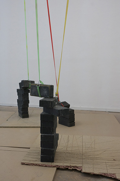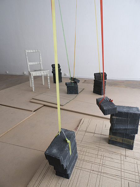 La question initiale dans le travail de Catherine Melin est celle du point d’appui. Etant donnés l’étendue et tout ce qui la ponctue, d’où partir, par où commencer, par où passer ? L’espace tout autour de nous nous contient et contient toutes choses : celles qui sont fixes et celles qui se meuvent, celles qui étaient là et celles qui ont été ajoutées par les hommes, lesquelles sont devenues aujourd’hui incroyablement nombreuses et proliférantes. Cette propension à en rajouter sans fin et à remplir les intervalles laissés vacants, nous pouvons y voir la forme moderne de ce que Wilhelm Worringer dans Abstraction et Einfühlung, un livre bien inutilement oublié aujourd’hui, caractérisa pour les temps primitifs en parlant de geistiger Raumscheu, ce que l’on peut traduire par « angoisse spirituelle devant l’espace » ou, plus simplement, « crainte de l’esprit devant l’espace ». Crainte qui est comme la version panique, elle-même affolante, d’une occupation pourtant nécessaire : pour que l’espace s’incarne et échappe au vide qui est sa tentation, il lui faut des objets et des formes, toute une écriture de lignes et de surfaces qui le traduisent dans une langue que le corps peut apprendre et comprendre. Habiter, vivre, c’est traverser avec son corps les espaces toujours différents de cette langue parlée par l’espace. Pour cette traversée il faut des intervalles, des points d’appui et des prises : et le monde entier, à commencer par l’univers urbain, consiste en un immense dispositif discontinu au sein duquel intervalles, prises et points d’appui, isolément ou en série, forment une syntaxe que chaque locuteur ou passant interprète à sa manière. En droit tout au moins, puisque dans les faits il arrive fréquemment que cette syntaxe, engorgée et répétitive, ne libère que des phrasés sériels programmés, qui répondent à la pression constante de la domination. Mais il est des points de monde qui sont des échappées ou des tremplins, des nœuds en train de se dénouer, où cette syntaxe se voit et redevient palpable, et dans un phrasé justement, mais qui aurait alors sauté hors du cadre. Les tubulures colorées d’une échelle, d’une passerelle, d’une balançoire ou d’un toboggan sont, et cela c’est Catherine Melin qui nous l’indique, de tels phrasés.