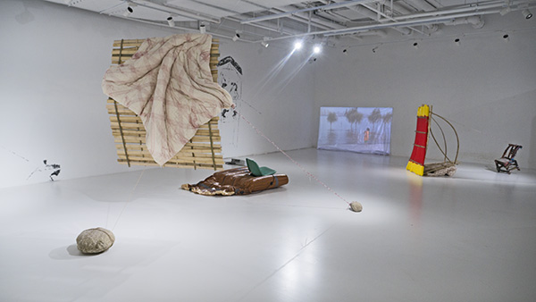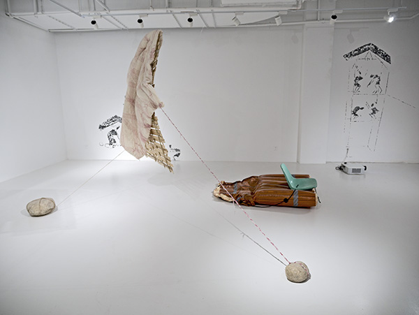 Dessin mural, vidéo 2'48 en boucle, gonflables, couvertures, palissades, chaises