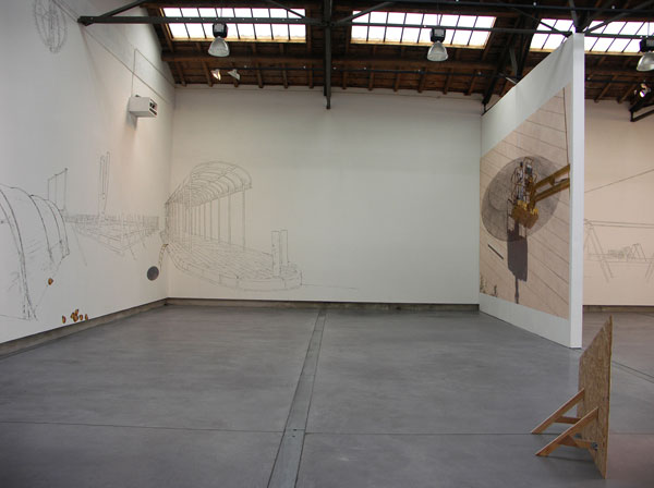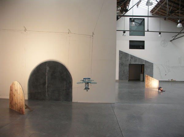 du bois consumé ; canalisée et happée par les strates denses des images en mouvement. Les espaces sont investis de lignes et de fils reconnaissables qui pourtant ont perdu leur attribut de vecteurs. Sectionnés puis réorganisés ils deviennent cordes tendues et suspendues, sillons à parcourir et à creuser, quadrillages et feuilletés toujours entr’ouverts laissant voir non ce qu’il y a derrière, mais qu’il y a un avant et un arrière. Souples et solides à la fois, étroitement entrelacées ou désunies, ces lignes, comme des portées libres, donnent à jouer et à rejouer des partitions variées à la mesure du corps. Prolongements des bras en outils de précision pour une lutte chorégraphiée ou des figures en vol. Graduations ramenant un espace trop grand à l’échelle du vivant. Cadres hors contexte pour des véhicules immobiles et des cabanes à transporter. Bases d’appui pour des corps élastiques qui se plient et se déplient, se déploient sans contraintes en gymnastes du dehors.