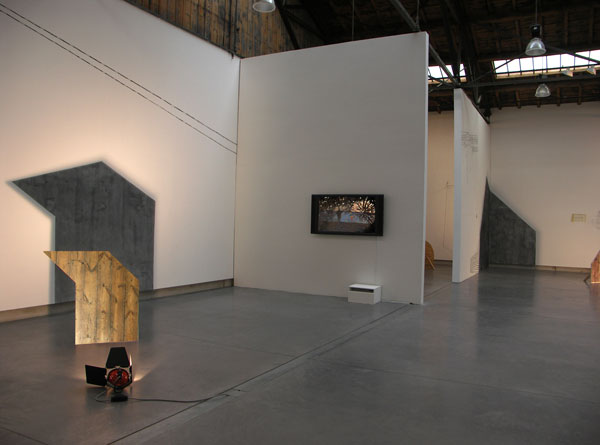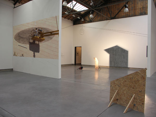 Vues de l'exposition "(...)artifice", Le 19 Crac, Montbéliard Dessins muraux (fusain), vidéo, autocollants photographiques, panneaux découpés, projecteurs (mandarines)