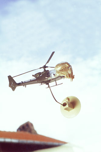 Squelette d’une tête de dorade royale, maquette d’hélicoptère en plastique, scotch, ventouse et support métallique.