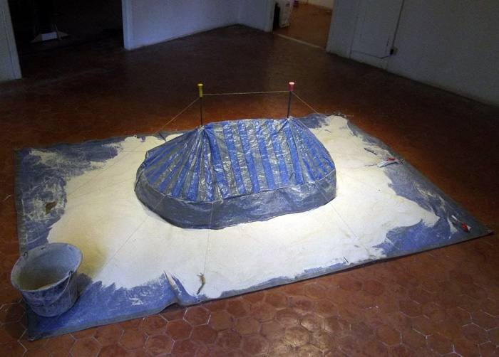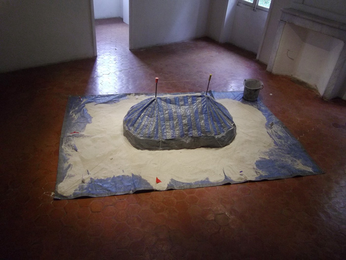Bâches de chantier, sable, seau, eau, ficelle, éléments divers, 60 x 300 x 200 cm