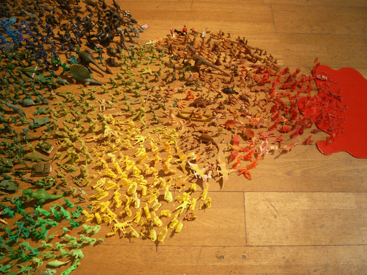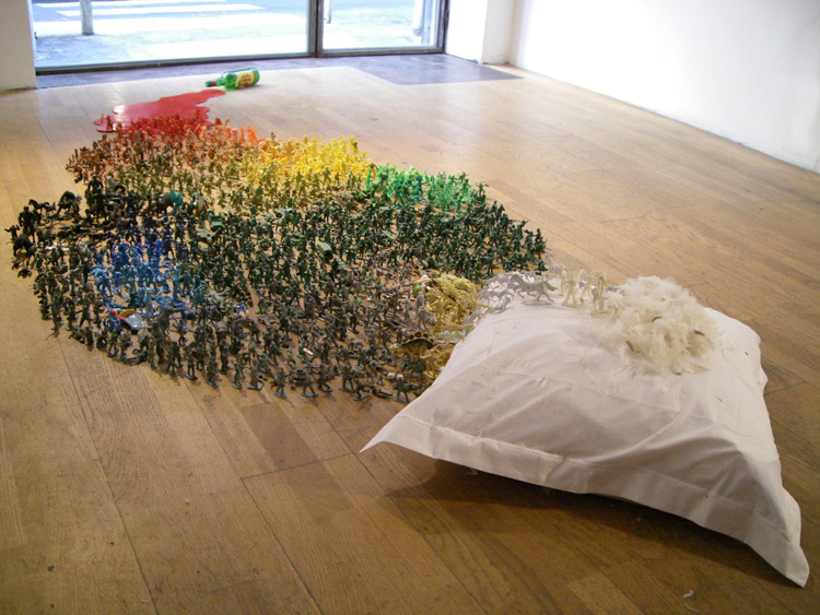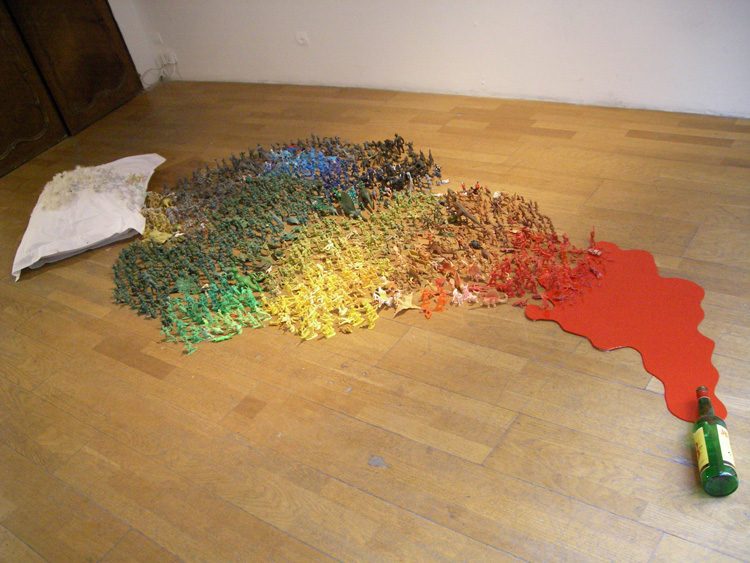 Oreiller, plumes, figurines colorées en plastique, bois peint, bouteille de whisky