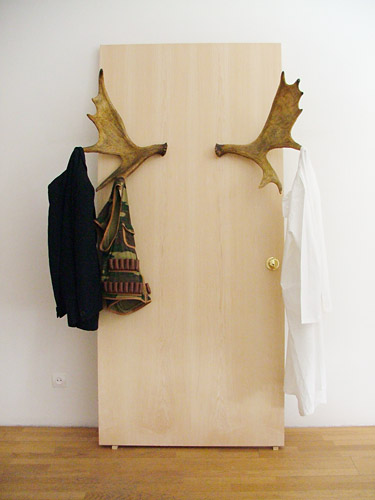 Porte plaquée érable, poignée ronde laitonnée, cales, panache d’orignal,