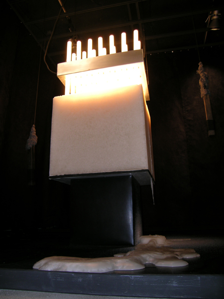 Installation, paraffine, acier, corde nylon, filasse de plomb, ampoules électriques linestra et câble.