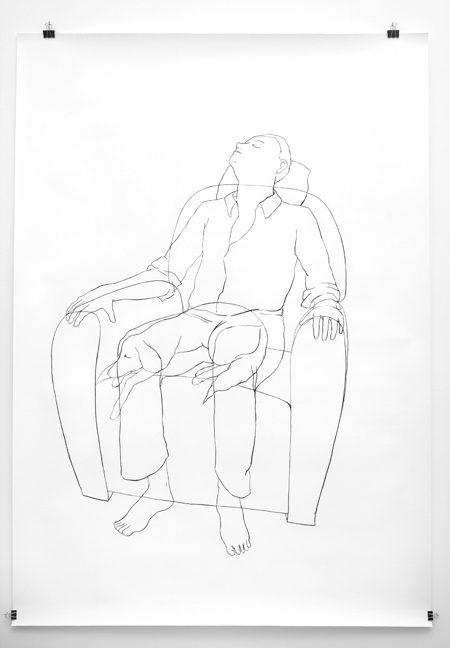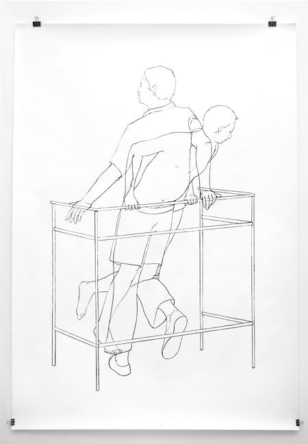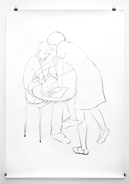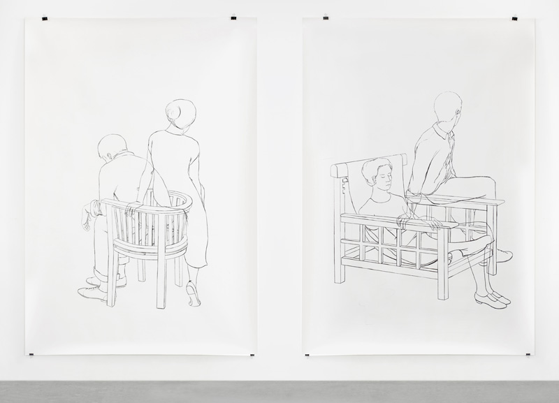 A community is bound by a territory, but also by a history. These drawings depict people who have visited the same place but at two different moments superimposed on the same image: in each image, one space that holds two figures in two instants. The drawing is the topo of their diachronic concomitancy. The meeting hasn’t occurred, but they are linked by the unavoidable and invisible connection shared by the members of a same community.
